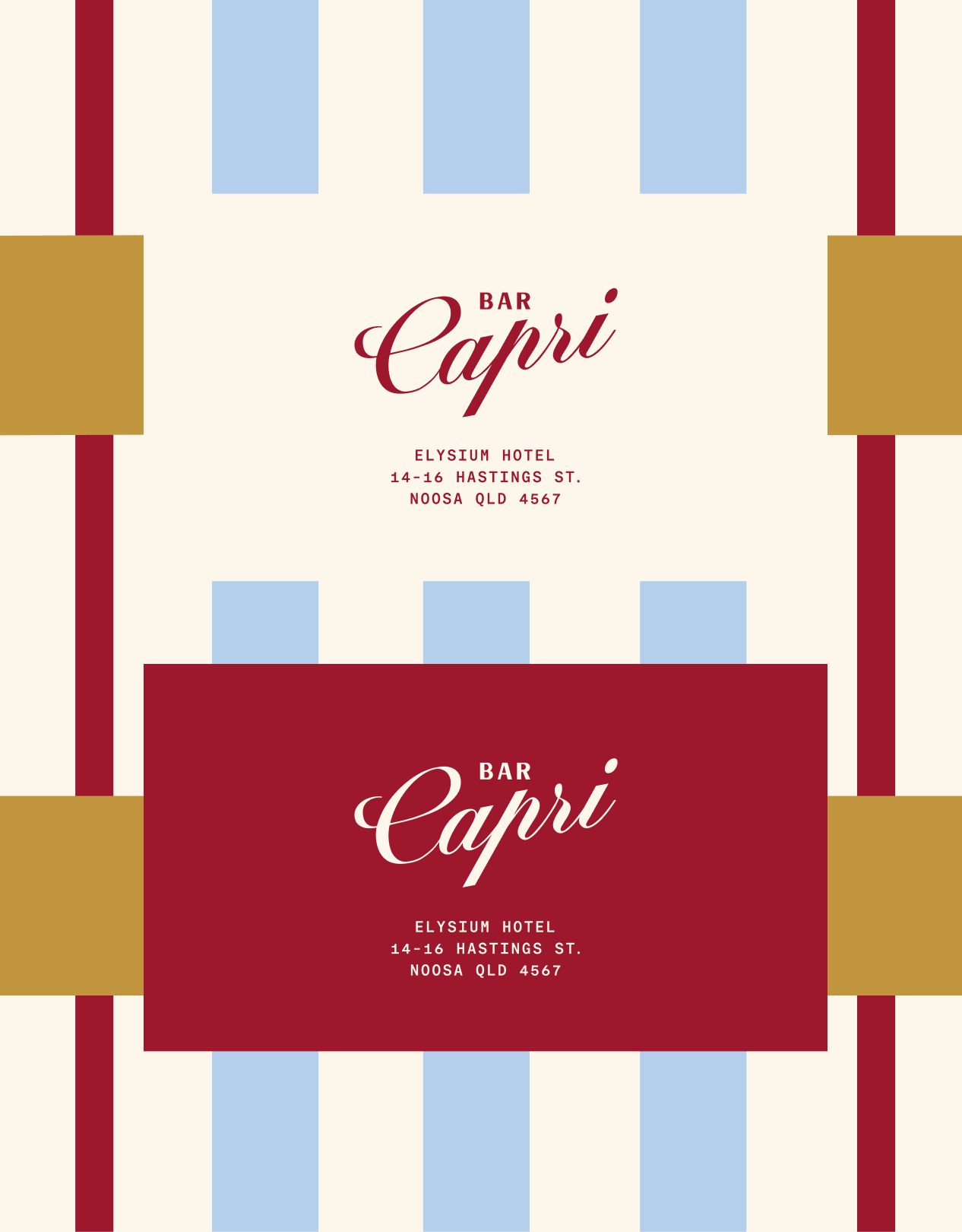 Just steps from main beach in the heart of Noosa, Bar Capri captures a relaxed Mediterranean sensibility infused with modern coastal Australian ease. Sun washed reds, soft blues and warm neutrals echo the rhythm of seaside days, while elegant typography and refined details nod to classic Italian café culture.